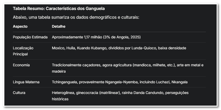 Historicamente, os Ganguela foram conhecidos pelos portugueses desde o século XVII, envolvidos no comércio de escravos, fornecendo cera, mel e marfim para o comércio de caravanas Ovimbundu no século XIX, conforme 101 Last Tribes: Ganguela People. Foram relativamente tardios na ocupação colonial, com resistência limitada, exceto dos Mbunda, e sua vida mudou menos durante o colonialismo, com atividade econômica principal em madeira, como indicado em Wikipedia: Ganguela. Sofreram perseguições de Ovimbundo, Lunda-Quioco e Ovambo, e muitos buscaram refúgio em Zâmbia e Namíbia durante a guerra anticolonial (1961–1974) e a guerra civil, conforme Wikipedia: Ganguela. A rainha Danda Candundo é um exemplo de liderança, destacando a ginecocracia.