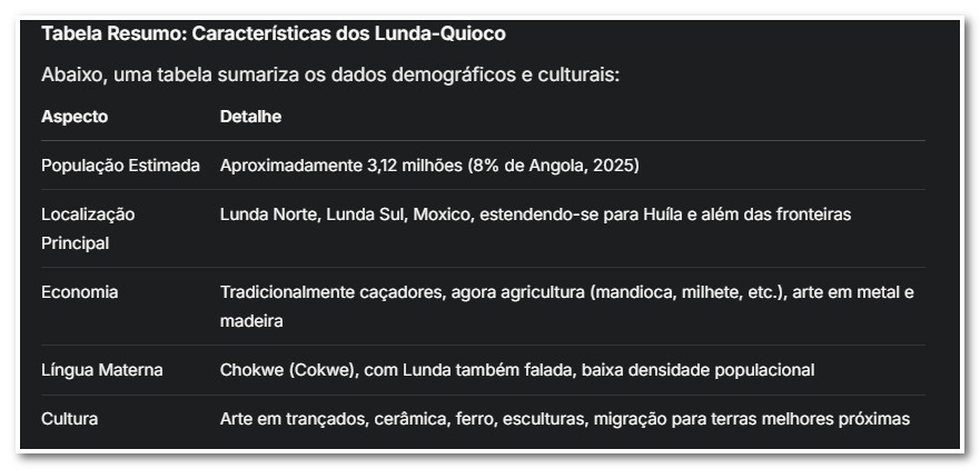 Historicamente, os Lunda-Quioco estabeleceram-se no nordeste de Angola no final do século XIX, com os Chokwe expandindo-se através de comércio de marfim e borracha no século XIX, conforme Gateway Africa Safaris: Chokwe Tribe. Os Lunda têm origens no Império Lunda, com centro em Shaba, Zaire, e expansão por absorção de chefes vizinhos, enquanto os Chokwe são conhecidos por sua interação com o comércio europeu, especialmente armas, no século XVIII. Essa história reflete sua dispersão e adaptação, com impacto na baixa densidade populacional.