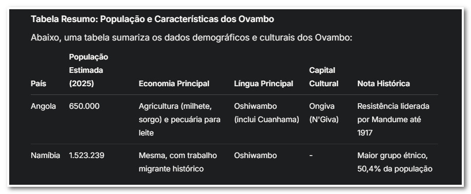 Os Ovambo, também conhecidos como Aawambo ou Ambo, são um grupo étnico banto predominante na Namíbia e presentes no sul de Angola, especialmente na província do Cunene. Estimativas atuais indicam uma população de cerca de 650.000 em Angola, conforme dados do Joshua Project (Joshua Project), representando cerca de 2% da população total angolana. Na Namíbia, o censo de 2023 reporta 1.523.239 Ovambo, correspondendo a 50,4% da população, conforme o relatório oficial (Namibia 2023 Population and Housing Census). Esses números sugerem um crescimento significativo em relação a estimativas históricas, como as mencionadas de 63.000 em Angola e 230.000 na Namíbia, que parecem datar de períodos anteriores, possivelmente do início do século XX, considerando o contexto histórico de resistência colonial.